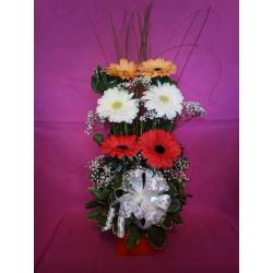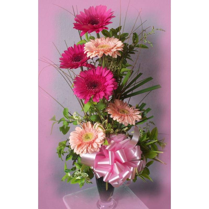 Gerberas surtidas de colores en copa de vidrio con follaje e ilusion